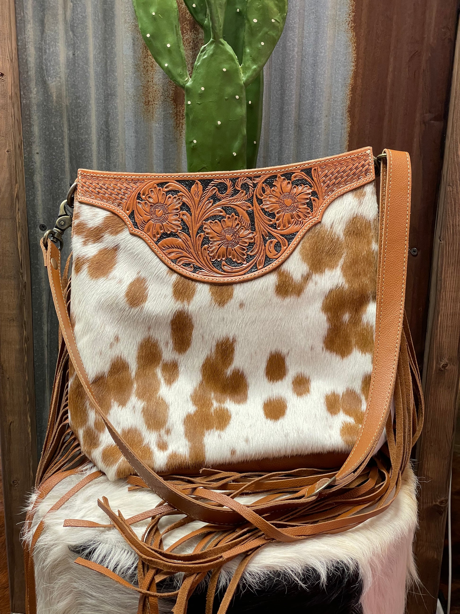 Brown leather cowhide bag,with leather fringe on both sides carry your essentials with style!